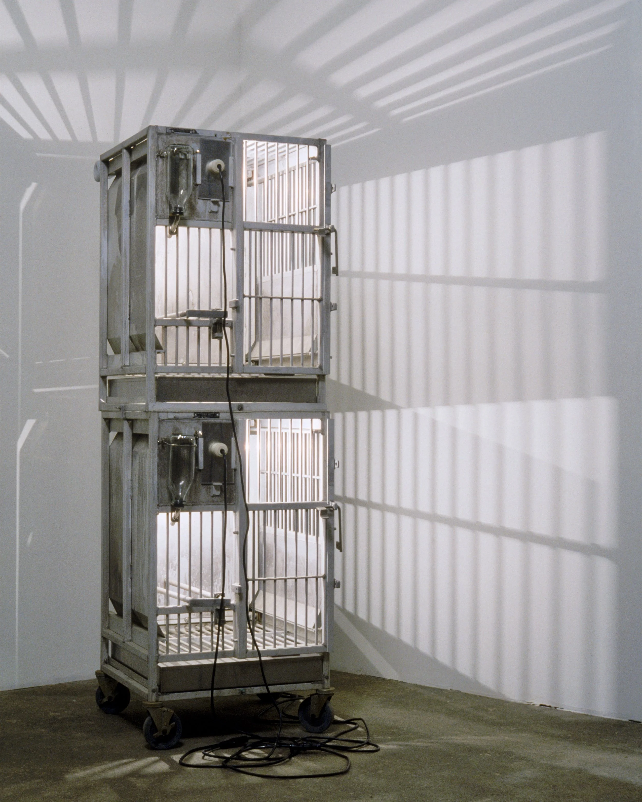 Hardwired, 1994; primate cage, steel, glass, rubber, electric fixtures; 80 x 28 x 31 inches
